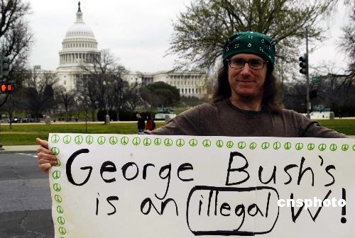 圖為一位示威者舉著的牌子上寫著“布什政府在伊拉克的戰(zhàn)爭是非法的,不道德的”。