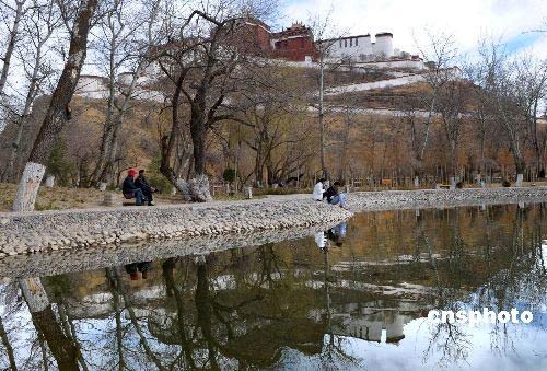 3月20日,拉薩市宗角祿康公園內(nèi),情侶們在湖邊享受春光。