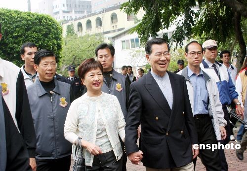 蕭萬長與夫人在臺(tái)北一個(gè)投票所投票后,在警力的保護(hù)下離開。