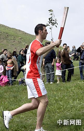 希臘當(dāng)?shù)貢r間3月24日,北京二00八年奧運會圣火采集儀式在古奧林匹亞競技場舉行,隨后火炬希臘傳遞開始。第一棒火炬手亞歷山大右手擎火炬,左手舉橄欖枝跑向顧拜旦墓。 中新社記者 王歡