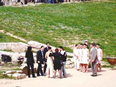 最激動(dòng)人心的時(shí)刻即將來臨,最高女祭司娜芙普利都將在赫拉神廟的凹面鏡前點(diǎn)燃奧運(yùn)圣火。從古競(jìng)技場(chǎng)到圣火采集地的赫拉神廟的路上,中間有一個(gè)通道,“禁地”前可謂戒備森嚴(yán),只有少數(shù)VIP貴賓才能進(jìn)入。這時(shí),章子怡也想起身近距離觀看點(diǎn)火儀式,但在通道前被安保人員攔住。他們顯然沒弄清楚這位美女的身份,很疑惑地看著章子怡,身邊的2008北京奧運(yùn)官方電影工作人員則趕忙解釋:“super star”(超級(jí)巨星)。但胸前只是掛著記者證,并非VIP證的章子怡,盡管舉著證交涉了半天,還是被攔在了赫拉神廟之外。