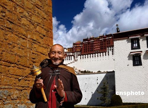 一位藏族信眾在布達(dá)拉宮轉(zhuǎn)經(jīng)。