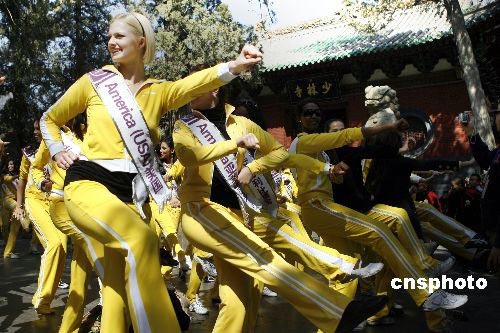 國際旅游小姐在少林寺模仿中國武術(shù)