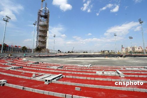 圖:奧運(yùn)“鳥巢”熱身場地塑膠跑道鋪設(shè)基本完成(2)