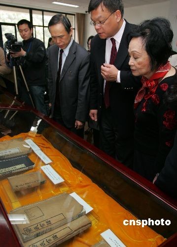 宋子文長(zhǎng)女馮宋瓊頤(右)在其親屬的陪同下參觀了上海圖書館,并對(duì)目前館藏的眾多名人家譜產(chǎn)生了濃厚的興趣。中新社發(fā) 湯彥俊 攝