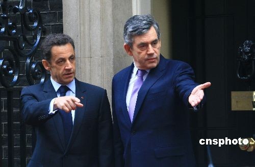 圖為布朗(右)和薩科奇會(huì)見后準(zhǔn)備離開,前往出席英法高峰會(huì)。中新社發(fā) 李鵬 攝
