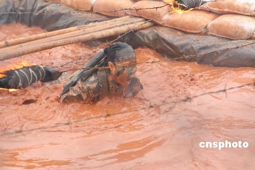 4月3日,美國海軍陸戰(zhàn)隊司令詹姆斯·康威上將一行在中國海軍南海艦隊野外兩棲登陸訓(xùn)練場,觀摩中國海軍陸戰(zhàn)隊某旅的軍事演練。擔(dān)負(fù)演練任務(wù)的海軍陸戰(zhàn)隊某旅是中國海軍第一支兩棲作戰(zhàn)部隊。圖為女陸戰(zhàn)隊員通過泥潭。中新社發(fā) 李唐 攝