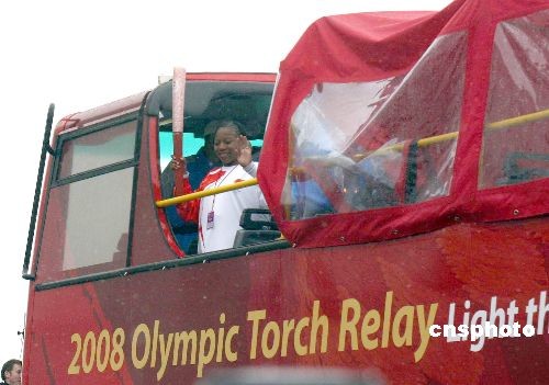 4月6日上午10時(shí)32分,倫敦大雪紛飛,獲得過五枚奧運(yùn)金牌的英國劃艇名將史蒂夫·瑞格夫手持祥云火炬穩(wěn)步跑出倫敦西北的溫布利體育場,北京奧運(yùn)圣火傳遞“和諧之旅”第四站隨之吹響號角。倫敦是北京奧運(yùn)圣火境外傳遞過程中,傳遞路線最長、最復(fù)雜的城市。約八個半小時(shí)的圣火傳遞,包括了輪船、自行車、敞篷公共汽車、輕軌等四種特殊傳遞方式。圖為第二棒火炬手乘坐具有倫敦特色的紅色雙層巴士離開溫布利體育場。中新社發(fā) 沈晨 攝