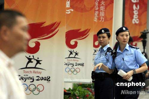 香港奧運火炬?zhèn)鬟f路線預(yù)演,俏麗警花維持秩序。 王麗南 攝