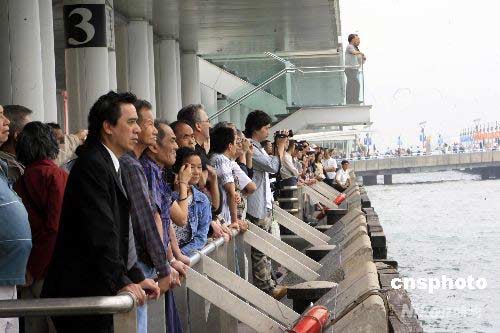 香港舉行北京奧運(yùn)火炬?zhèn)鬟f路線預(yù)演,吸引眾多市民游人在岸邊觀看。王麗南 攝