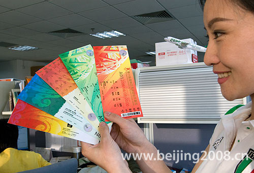 中新網(wǎng)4月23日電 北京時(shí)間今天上午,“北京奧運(yùn)會(huì)第三階段票務(wù)銷售情況新聞發(fā)布會(huì)”在北京奧運(yùn)新聞中心舉行。北京奧組委票務(wù)中心主任朱炎和北京奧運(yùn)會(huì)奧運(yùn)藝術(shù)中心主任王敏一起揭開(kāi)了北京奧運(yùn)會(huì)門票的票樣。