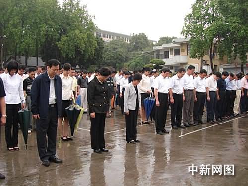 五月十九日十四時二十八分,近千名福建漳州市黨政機關干部冒著綿綿細雨,在政府大院的國旗下默哀,深切哀悼四川汶川大地震遇難同胞。正在當?shù)乜疾斓娜珖舜蟪N瘯蔽瘑T長陳至立(前排左二),和福建省政府、人大官員一起參加默哀。呂峰鵬 攝