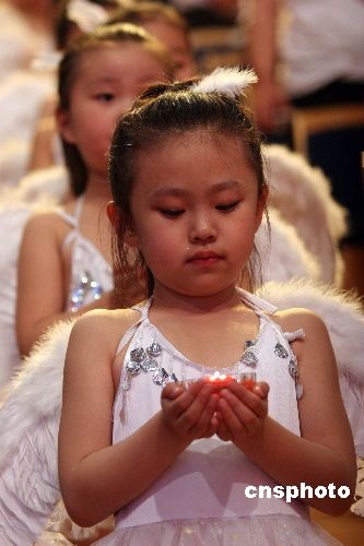 2008年5月19日,河南電視臺都市頻道舉行賑災(zāi)捐款晚會,來自鄭州多所學(xué)校的小學(xué)生手舉“和平鴿”為四川地震災(zāi)區(qū)人民祈福。