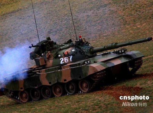 參加“礪兵--2008”演習的中國人民解放軍部隊,9月22日在北方某地進行紅、藍軍聯(lián)合演練。參演雙方主力分別是濟南軍區(qū)某機械化步兵旅和北京軍區(qū)某裝甲團!八{方A作戰(zhàn)集團”主力北京軍區(qū)裝甲團,是一支裝備新型坦克,在全軍率先完成主戰(zhàn)裝備的信息化改造,具備復雜電磁環(huán)境下作戰(zhàn)能力的裝甲勁旅。“紅方B作戰(zhàn)集團”以濟南軍區(qū)機步旅為主,加強陸航空降兵兵力。解放軍新型主戰(zhàn)坦克亮相。中新社發(fā) 宋吉河 攝