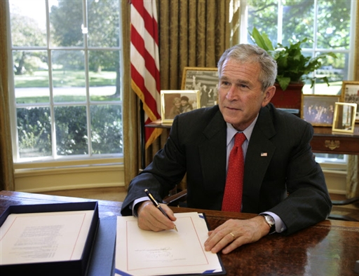 在去財政部探望了那里的工作人員,并鼓舞他們的士氣后,布什回到他白宮的橢圓形辦公室,簽署了這個史上規(guī)模最宏大的救市法案。他還特地邀請了各大媒體的攝影記者,記錄下這歷史一刻。
