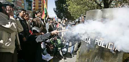 示威群眾向使館扔石塊和鞭炮,要求降下使館的旗子。警察發(fā)射催淚彈和水槍,運用防暴警車,與示威者發(fā)生沖突。至少有1名警察和2名示威者受傷。埃拉爾多的一位市議員說,“因為警察的鎮(zhèn)壓暴力我們失去了一場戰(zhàn)斗,但是明天或某一天我們還會再來燒使館”。警察用防暴車擋住使館的主要入口。示威者高呼“正義,正義”的口號,曾沖破警戒線,威脅要燒使館的大樓。前國防部長曾卷入2003年10月造成67人死亡和400人受傷的事件,那次事件以后當時的德拉索達總統(tǒng)被迫辭職。民意測驗表明,莫拉萊斯總統(tǒng)在埃拉爾托市的民眾支持率高達70%.(管彥忠)