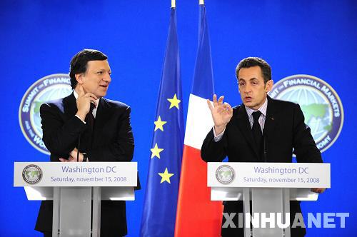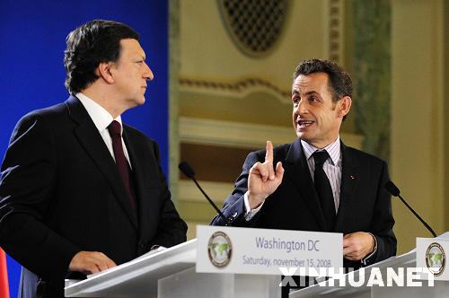 11月15日,在美國首都華盛頓出席二十國集團領(lǐng)導(dǎo)人金融市場和世界經(jīng)濟峰會的法國總統(tǒng)薩科齊(右)和歐盟委員會主席巴羅佐聯(lián)合舉行新聞發(fā)布會。 新華社記者張巖攝