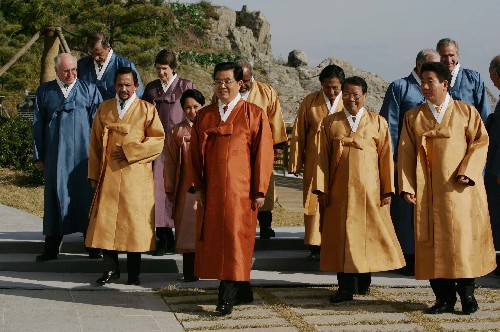 資料圖片:2005年11月19日,國家主席胡錦濤出席亞太經(jīng)合組織第十三次領(lǐng)導(dǎo)人非正式會議。圖為胡錦濤主席等亞太經(jīng)合組織成員的領(lǐng)導(dǎo)人身著韓國民族特色的服裝“圖魯馬吉”合影后,前往出席《亞太經(jīng)濟(jì)合作組織第十三次領(lǐng)導(dǎo)人非正式會議釜山宣言》的宣讀儀式。樊如鈞 攝