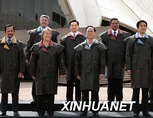 2007年9月8日,亞太經(jīng)濟(jì)合作組織第十五次領(lǐng)導(dǎo)人非正式會議第一階段會議開始前,各成員領(lǐng)導(dǎo)人身著澳大利亞特色服裝在悉尼歌劇院合影。新華社記者黃敬文攝