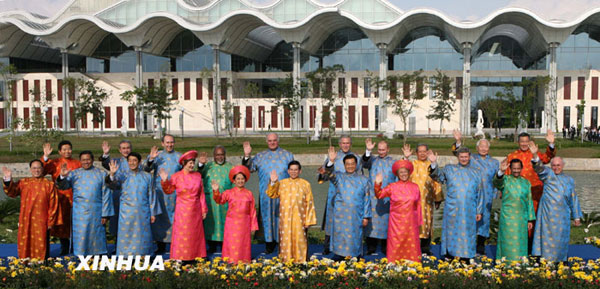 2006年11月19日,亞太經(jīng)合組織各成員領(lǐng)導(dǎo)人身穿越式傳統(tǒng)服裝,集體在越南首都河內(nèi)國家會議中心西島合影留念。 新華社記者 樊如鈞 攝