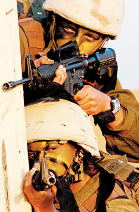 M-4A1卡賓槍——以色列士兵貼身武器,有效射程不超過300米。對(duì)比AK-47來說,M-4A1卡賓槍在精度上有優(yōu)勢(shì),但在射程及殺傷性上稍微遜色。(木生 李亮亮 沈基飛)
