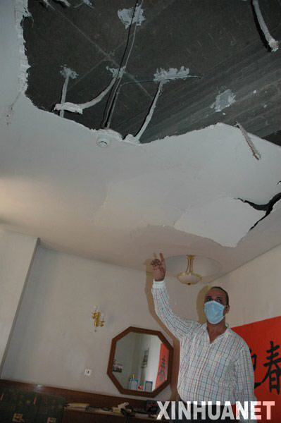 就在拿到相機(jī)轉(zhuǎn)身的一瞬間,第二聲巨響響起,整個(gè)大樓劇烈顫抖起來,陽(yáng)臺(tái)的玻璃門爆裂,無數(shù)的碎玻璃打在記者剛離開的辦公桌前。陽(yáng)臺(tái)上的衛(wèi)星電話、辦公桌上的英文字典和地上的垃圾桶被氣浪掀飛起來,記者也被氣浪掀倒在沙發(fā)后。鋁合金門框整個(gè)砸到墻上。記者的頭頂碎石亂飛,天花板出現(xiàn)了3個(gè)大窟窿,落下的天花板砸在記者床上。樓道里傳來其他房間的天花板和門窗倒塌之聲,嗆人的煙霧充滿整個(gè)樓道。