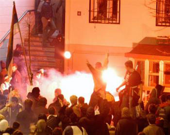 事件發(fā)生時,至少有15萬塞族示威者在貝爾格萊德市中心舉行集會,塞爾維亞總理科什圖尼察對示威者發(fā)表了譴責科索沃獨立的激情演講。大部分塞族人把科索沃視作塞爾維亞的宗教和文化發(fā)源地。