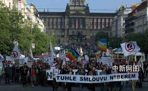 據聯(lián)合早報網報道,游行隊伍從布拉格瓦茨拉夫廣場出發(fā),朝總理府前進。游行者手舉“不要雷達基地”、“對雷達說不”等旗幟和標語牌,他們也高喊抨擊政府的口號。