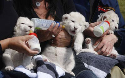 該動物園的兩只母白獅6月30日同時產(chǎn)下總共7只小白獅。7只小白獅4只為雄性,3只為雌性。但是其中一只母獅拒絕喂養(yǎng)自己的4只小獅子,因而動物園的管理員飼養(yǎng)了這些可愛的小家伙。