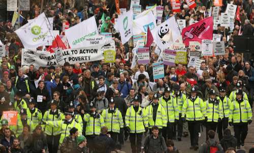 示威者行經(jīng)國會大樓,吹響哨子,大喊“我們憎恨銀行”,標語五花八門,有“人民為先、利潤居后”、“離開伊拉克和阿富汗”等,部分語句則較為激進,如“問吊銀行家”、“沖擊銀行”。當他們行至唐寧街的首相府時,紛紛報以噓聲。