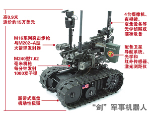 部署到阿富汗的智能機器人“赫耳墨斯”主要用于探穴鉆洞,它身上安裝有兩個照相機,能爬進漆黑洞穴并向外發(fā)送圖片;美軍機器人“劍”在伊拉克戰(zhàn)場更是神通廣大,它能輕易通過任何阻礙,備彈200發(fā),裝備一挺經(jīng)改造的M249型機槍,射速高達1000發(fā)/分鐘,火力強度足以與一挺重機槍媲美;而“背包”機器人則能在巷戰(zhàn)環(huán)境中捕捉、分辨反美武裝狙擊手的細微動靜;“嗅彈”機器人能靈敏地嗅出偽裝起來的爆炸物;名為“仿生蒼蠅”的機器人則可做一些復(fù)雜的手術(shù)……