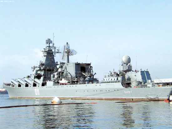 俄羅斯海軍也派出素有“航母殺手”之稱的“瓦良格”號導(dǎo)彈巡洋艦參加此次閱兵式。該艦已于13日從符拉迪沃斯托克的金角灣出發(fā)前往中國!巴吡几瘛碧柺嵌砹_斯太平洋艦隊的旗艦,主要武器為16枚SS-N-12超音速反艦導(dǎo)彈,可攜帶1000公斤裝藥的常規(guī)彈頭或射程達(dá)300海里的戰(zhàn)術(shù)核彈頭。