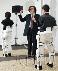 筑波大學教授山海嘉之(中)正在講解“機器人Suit HAL”如何幫助老年人及殘疾人。