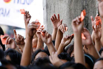 4月18日,菲律賓馬尼拉,大批貧民手持對換劵擁擠在一起,等候領(lǐng)取裝有大米和罐頭的禮物包。這是菲律賓前總統(tǒng)埃斯特拉達為慶祝自己71歲生日,而特意向窮人施舍的。