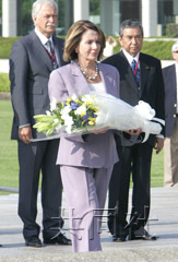 美國眾院議長佩洛西向廣島核爆紀(jì)念碑獻花。后排右側(cè)為日本眾院議長河野洋平。