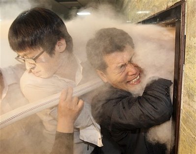 圖為韓國執(zhí)政黨議員使用滅火器阻止在野黨人士進入會議室。