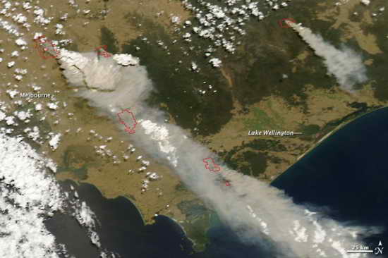 美國(guó)宇航局“阿卡”(取自拉丁文,意思是“水”。)衛(wèi)星中分辨率成像光譜儀所拍攝到的衛(wèi)星圖片反映了澳大利亞維多利亞州2月7日的山火情況,維多利亞州有多處發(fā)生山火(用紅色標(biāo)出)。由于受到大風(fēng)的影響,大團(tuán)煙霧正向東南方擴(kuò)散。澳大利亞?wèn)|北部的內(nèi)陸沙漠正在刮沙塵暴。新聞報(bào)道稱,這些山火是在數(shù)小時(shí)內(nèi)出現(xiàn)并快速蔓延的。