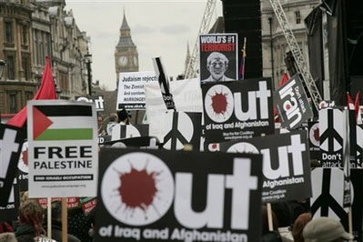 “停止戰(zhàn)爭(zhēng)聯(lián)盟”發(fā)言人表示:“伊拉克被占領(lǐng)的結(jié)果,是估計(jì)導(dǎo)致100萬人死于暴力!彼提到阿富汗戰(zhàn)事,指布朗不斷增兵阿富汗,可能成為另一場(chǎng)像伊拉克的災(zāi)難。格拉斯哥亦有幾百名示威者高舉“撤出伊拉克和阿富汗”的標(biāo)語(yǔ)牌。