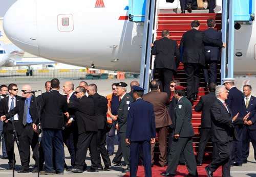 剛剛結(jié)束對以色列訪問的薩科齊夫婦以及隨訪的法國官員正同以色列總統(tǒng)佩雷斯和總理奧爾默特等人握手告別。法國安全人員突然涌過來讓薩科齊夫婦迅速上飛機(jī),而以色列安全人員也迅速轉(zhuǎn)移了佩雷斯和奧爾默特。