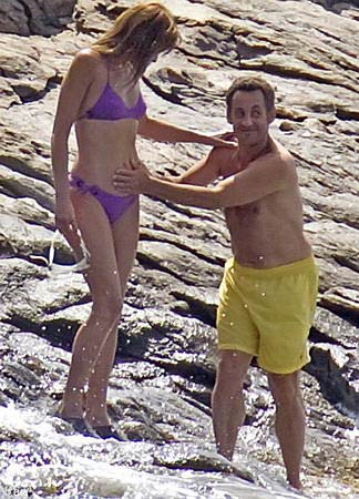薩科齊夫婦當時正在法國里維埃拉的家庭別墅度假。照片中的布呂尼身穿一件紫色比基尼,53歲的薩科齊則穿著一件黃色泳褲,他親吻了布呂尼并溫柔地撫摸布呂尼的腹部。