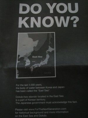 據(jù)《朝鮮日報》報道,韓國門戶網(wǎng)站Daum表示,用11萬余名網(wǎng)民募捐的資金,于25日(當?shù)貢r間)在《華盛頓郵報》刊登了整版的獨島廣告。廣告執(zhí)行者由徐景德?lián)危?月份在歌手金長勛等人的贊助下,在《紐約時報》刊登了獨島宣傳廣告“DO YOU KNOW?(你知道嗎)”。