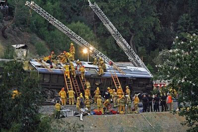 12日下午4時(shí)23分,一輛從洛杉磯聯(lián)合火車站出發(fā)的乘客列車,與另一輛在同一軌道上迎面駛來(lái)的貨車相撞。乘客列車撞后出軌,側(cè)翻在路旁。列車上共有222名乘客!堵迳即墪r(shí)報(bào)》報(bào)道說(shuō),列車上可能最多有400名乘客。約250名消防員、警察趕到現(xiàn)場(chǎng)救援。