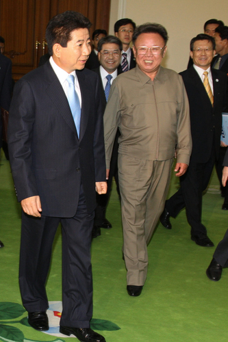 資料圖:2007年10月3日,韓國總統(tǒng)盧武鉉與朝鮮國防委員長金正日舉行首次首腦會談時,就金正日前一天親自出來迎接表達(dá)謝意,而金正日對此以“我又不是患者”來回應(yīng),再次表現(xiàn)出其幽默的一面。