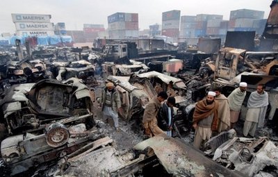 中新網(wǎng)12月8日電 據(jù)美國媒體報道,巴基斯坦當(dāng)局7日說,大約300多名被懷疑是塔利班激進(jìn)分子的人當(dāng)天襲擊并摧毀了近200輛卡車,這些卡車上裝有物資,有些是屬于美軍及北約聯(lián)軍車隊(duì)的軍車。一名保安也在襲擊中喪生。