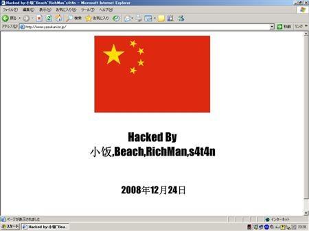 12月24日,靖國神社官方網站的主頁被抹去,并寫上英語“網頁被小飯、海灘、里奇曼、s4t4n攻擊”( Hacked By 小飯,Beach,RichMan,s4t4n),最后落款日期“2008年12月24日”。報道稱,網頁上還畫有中國國旗,因此可能是國外黑客的“不法襲擊”。
