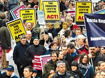 示威由愛爾蘭總工會(ICTU)發(fā)起。不少示威者來自全國,甚至帶同小孩游行。工會指摘商界精英摧毀經(jīng)濟,卻要平民受災。ICTU領袖貝格說:“我們憤怒,因為下一代未出生便要背負按揭重擔,為的只是挽救銀行業(yè)!