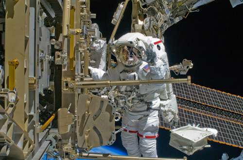 美國太空人甘保二十日執(zhí)行任務(wù)時,停下來向鏡頭揮手。(美國宇航局圖)