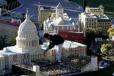 中新網(wǎng)1月17日電 為慶祝奧巴馬20日就任美國(guó)新總統(tǒng),模型玩家麥克因提爾15 日在加州卡爾斯巴德市樂高樂園以樂高積木搭成一座仿真總統(tǒng)就職典禮的模型。