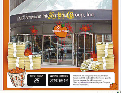網(wǎng)站目標是收集640萬個西紅柿,象征AIG一名高層獲發(fā)的最大一筆花紅。網(wǎng)民還可參與網(wǎng)上請愿聯(lián)署,要求國會收回AIG派發(fā)的逾2億美元花紅。請愿書道:“有份制造金融危機的AIG高層,無論如何都不應獲發(fā)花紅。那是我們的錢,你們(國會)應不惜一切代價把錢收回!