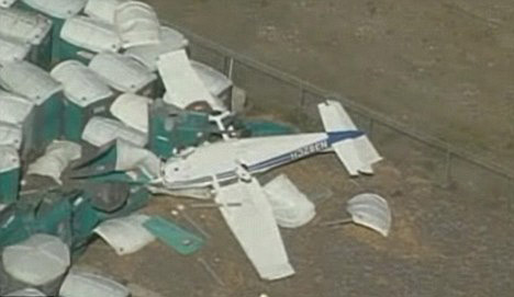 中新網(wǎng)5月6日電 美國一架塞斯納小型飛機(jī)日前緊急迫降在一個(gè)移動(dòng)廁所上,飛行員幸免遇難。這架塞斯納182飛機(jī)在美國華盛頓州塔科馬東南的一個(gè)機(jī)場起飛后就出現(xiàn)了引擎故障。